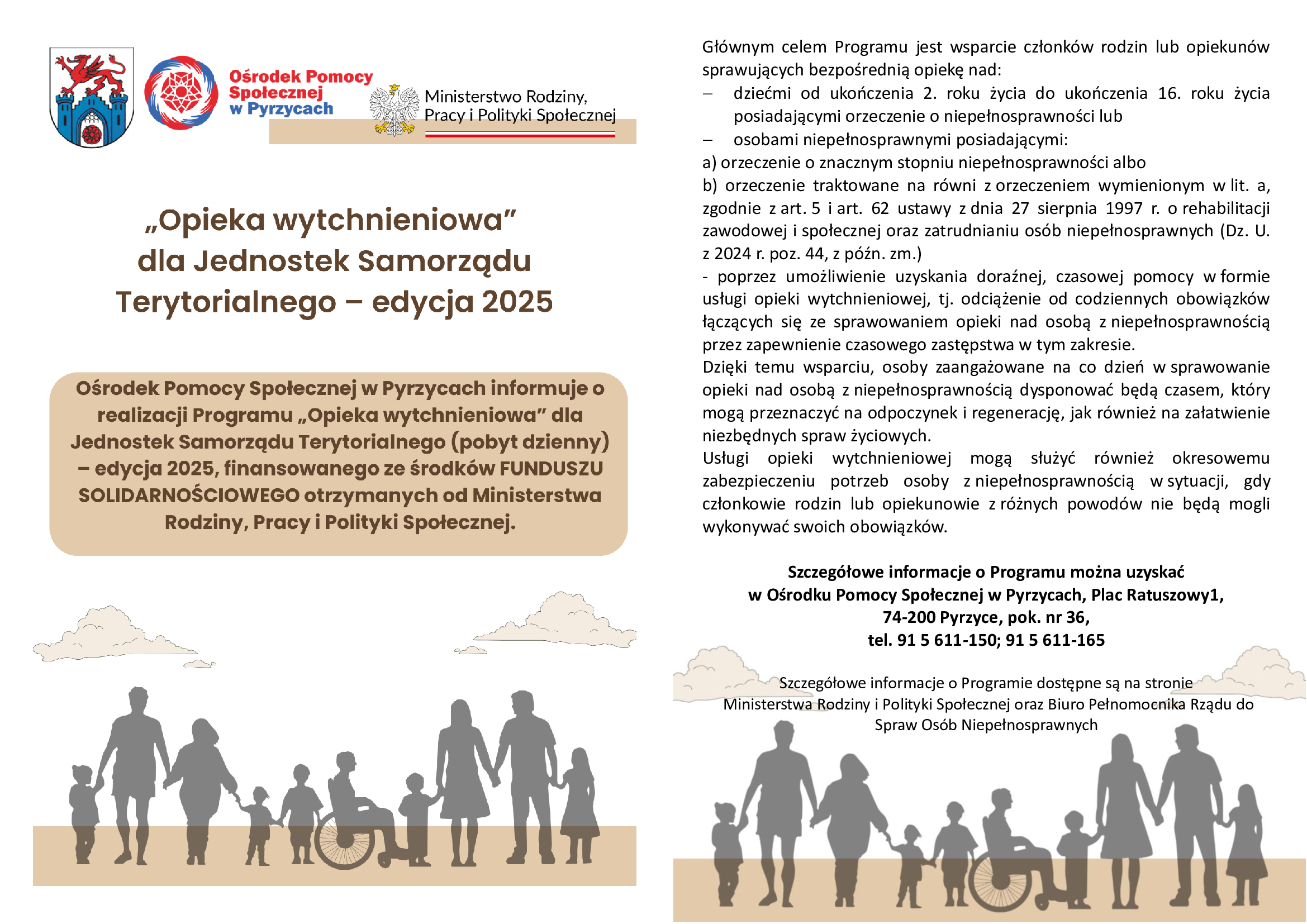 Ośrodek Pomocy Społecznej w Pyrzycach informuje o realizacji Programu „Opieka wytchnieniowa” dla Jednostek Samorządu Terytorialnego (pobyt dzienny) – edycja 2025, finansowanego ze środków FUNDUSZU SOLIDARNOŚCIOWEGO otrzymanych od Ministerstwa Rodziny, Pracy i Polityki Społecznej.